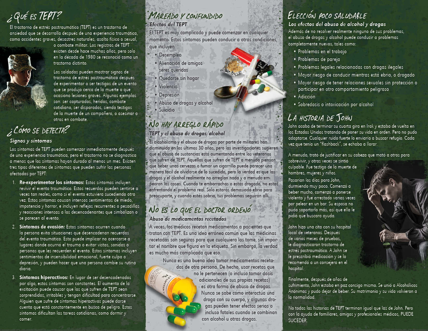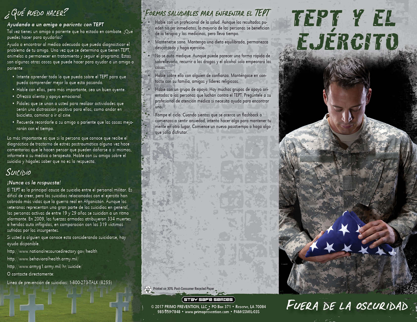 This pamphlet discusses the symptoms of PTSD, warning signs, prevention, facts and finding support.