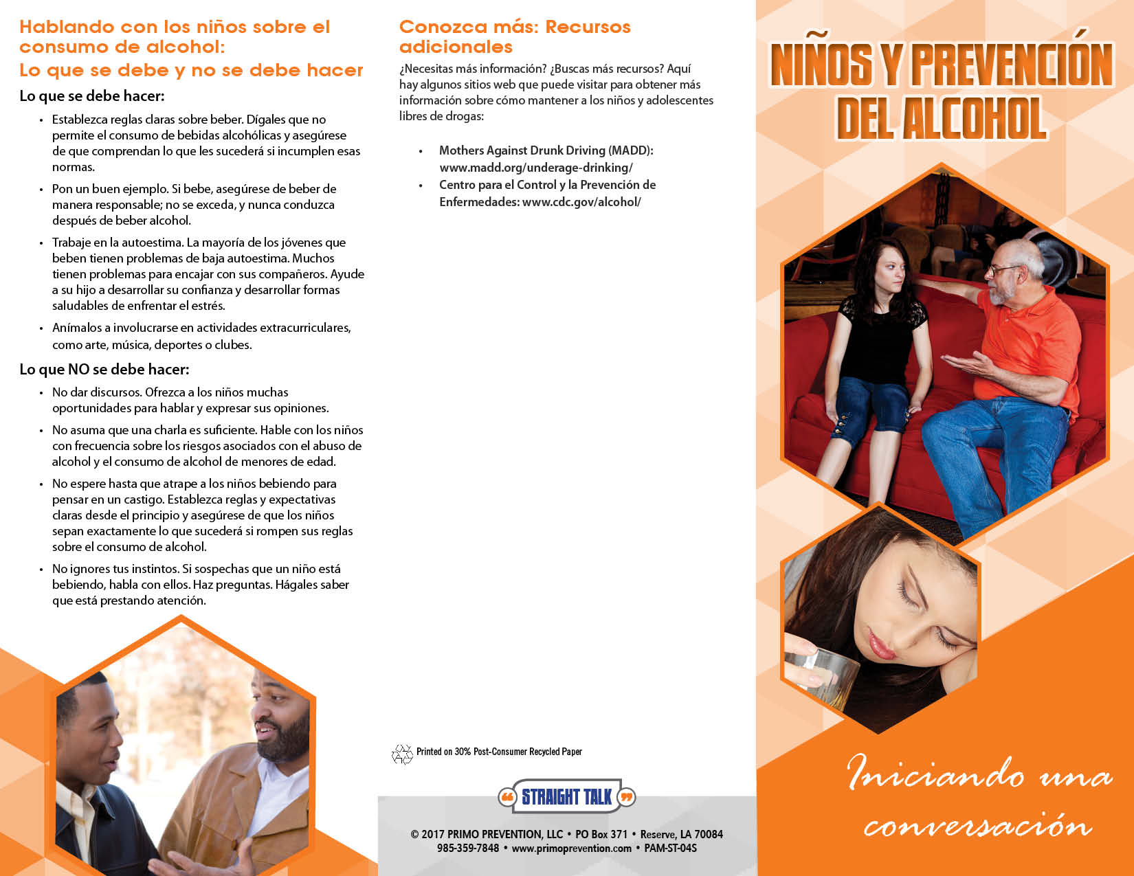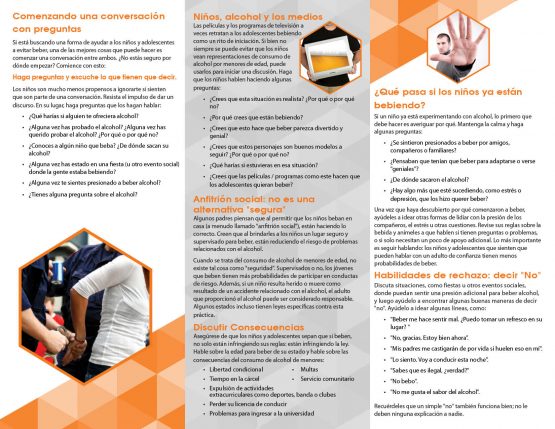 Topics discussed are: asking questions, listening and being patient instead of reacting, tips for do’s and don’ts, help with refusal skills, consequences of drinking, media influence and what to do if a child is already drinking.