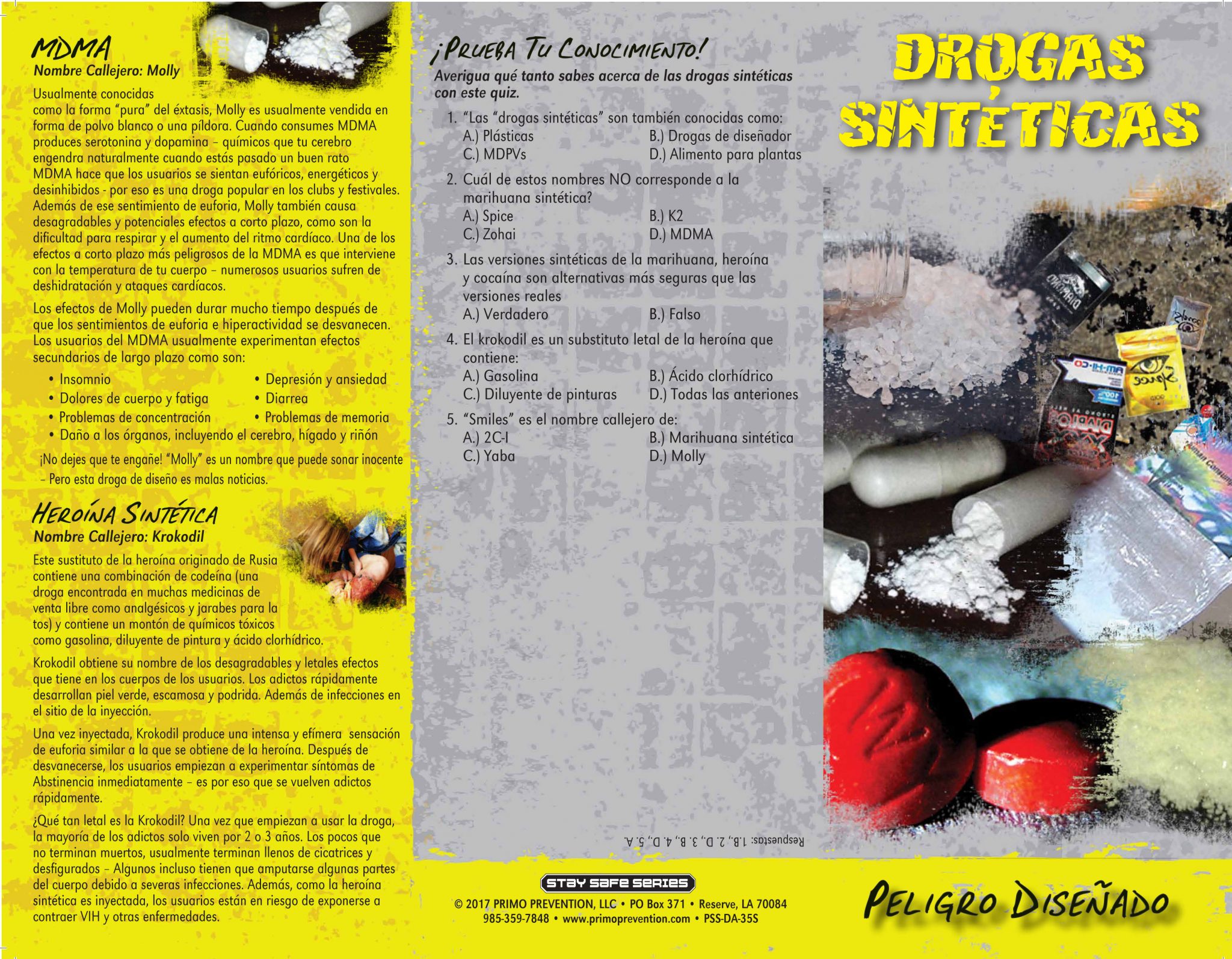 Feeling overwhelmed about the prevalence of new drugs these days? This pamphlet teaches the facts about these deadly drugs made in labs and how and why to avoid them. Topics covered are: Synthetic Marijuana (K-2 & Spice), Synthetic Cocaine (Bath Salts), 2c-1 (Smiles), 25-i (N-BOMBe), MDMA (Molly), Synthetic Heroin (Krokodil) and yaba.