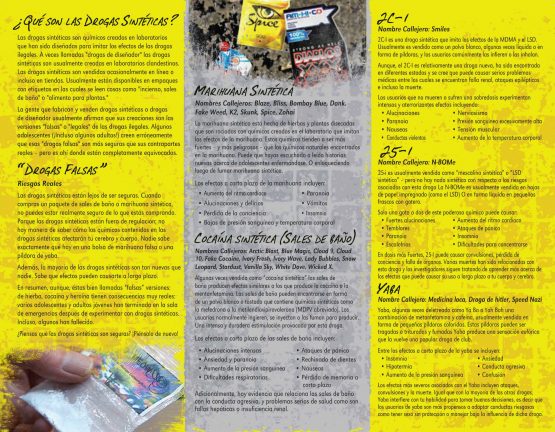 Feeling overwhelmed about the prevalence of new drugs these days? This pamphlet teaches the facts about these deadly drugs made in labs and how and why to avoid them. Topics covered are: Synthetic Marijuana (K-2 & Spice), Synthetic Cocaine (Bath Salts), 2c-1 (Smiles), 25-i (N-BOMBe), MDMA (Molly), Synthetic Heroin (Krokodil) and yaba.