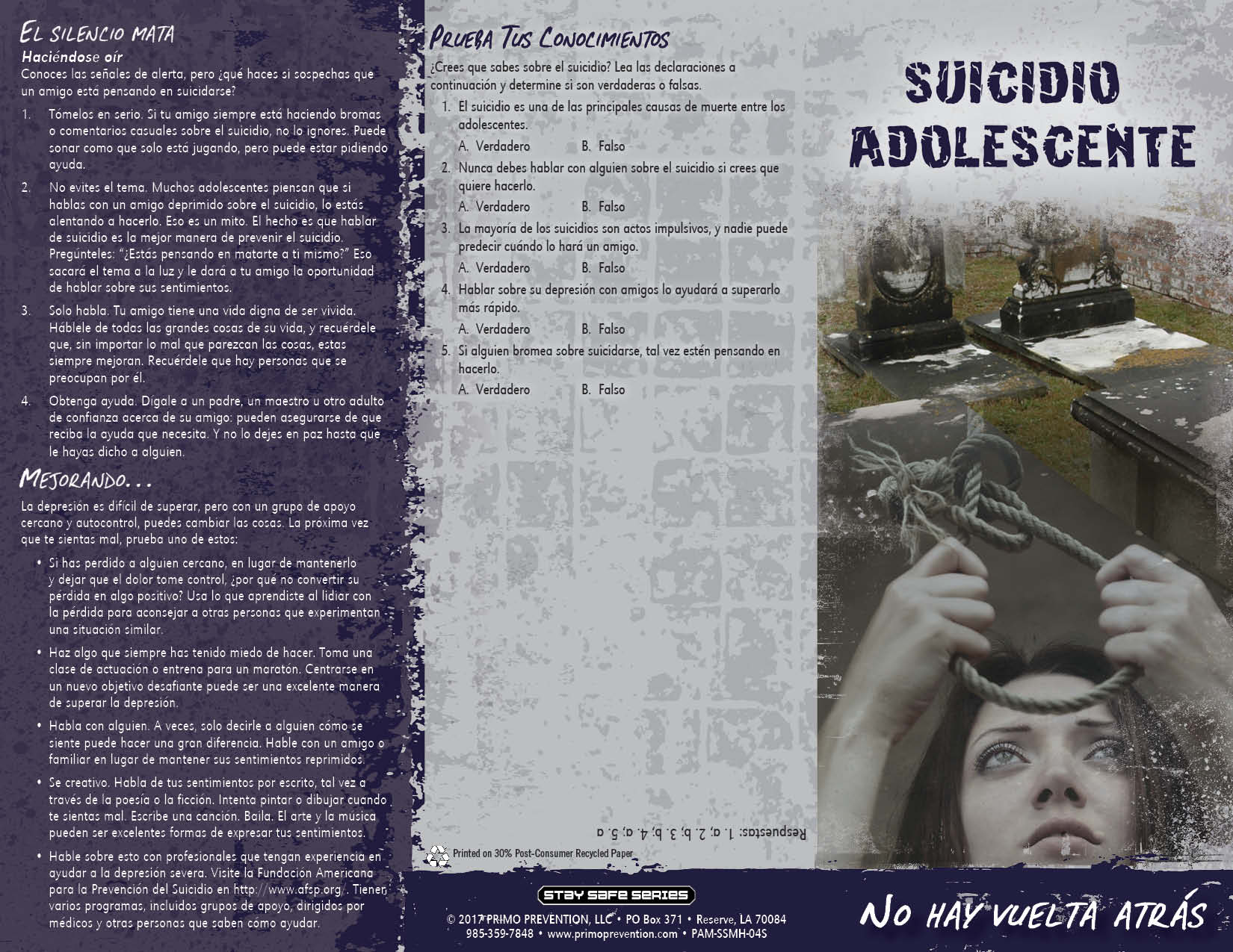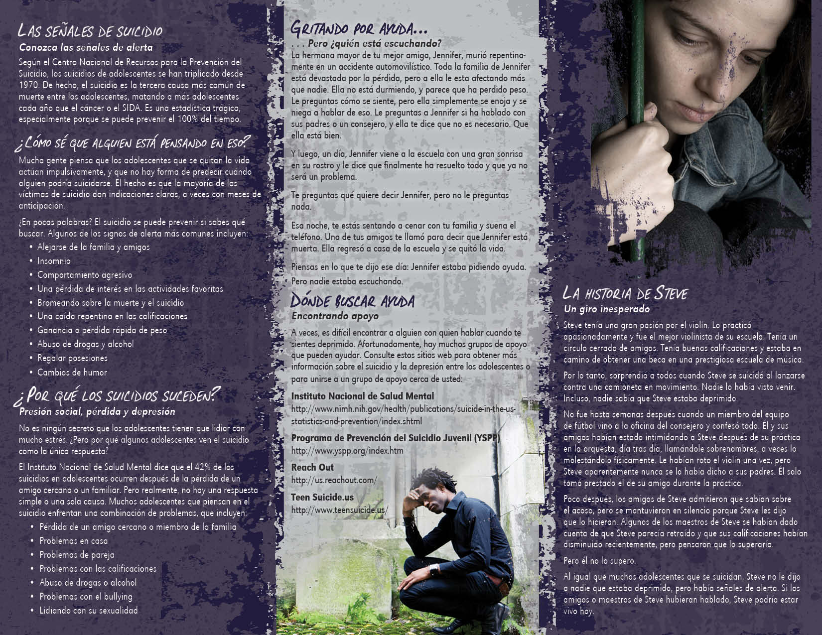 This pamphlet discusses why suicides happen, warning signs, speaking up, overcoming depression and finding support.