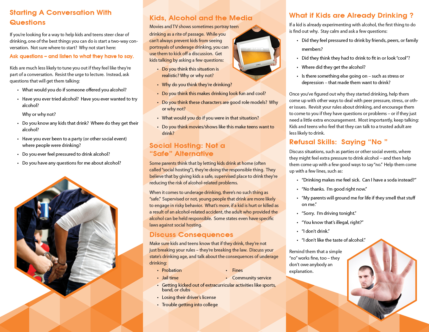 How hard is it to start a conversation with kids and teens about the dangers of alcohol? It’s not as hard as you think, if you are able to involve them in a discussion, rather than lecturing them. This pamphlet offers tips to parents, counselors, teachers and anyone who works with kids. Topics discussed are: asking questions, listening and being patient instead of reacting, tips for do’s and don’ts, help with refusal skills, consequences of drinking, media influence and what to do if a child is already drinking.