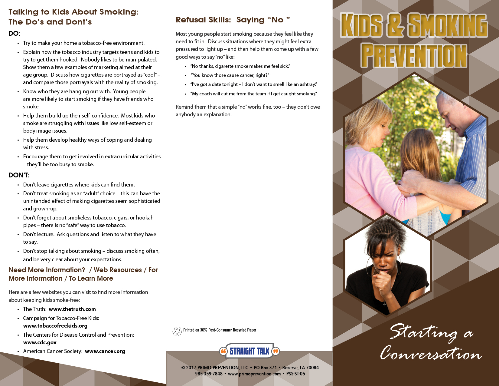 How hard is it to start a conversation with kids and teens about the dangers of smoking? It’s not as hard as you think, if you are able to involve them in a discussion, rather than lecturing them. This pamphlet offers tips to parents, counselors, teachers and anyone who works with kids.