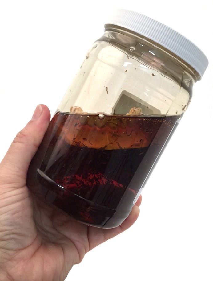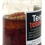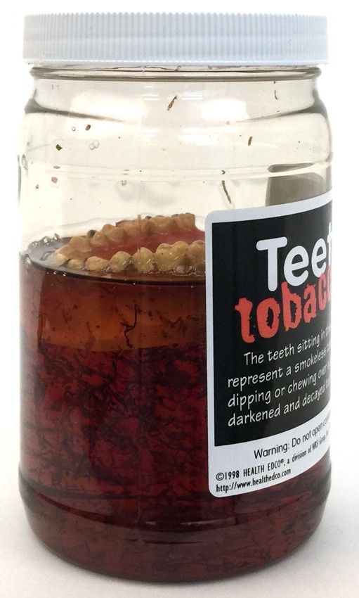 Sealed in a plastic jar of simulated tobacco juice containing tobacco flakes, this model of damaged and decayed teeth and gums sends a clear message about the effects of smokeless tobacco use. 3½” x 6″.