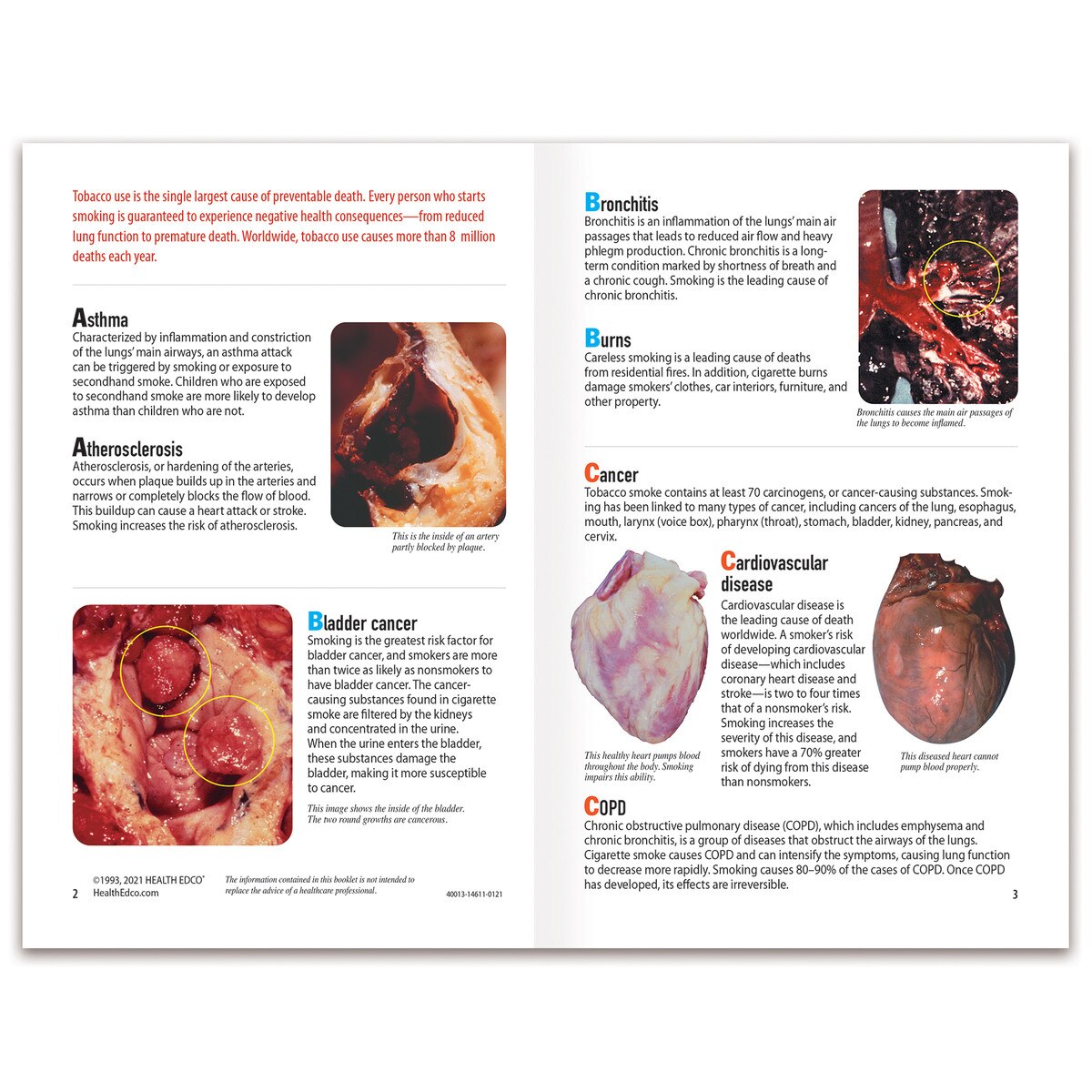 With medical photography and clear text, this booklet presents alphabetical listings of conditions and diseases caused by smoking, including asthma, atherosclerosis, bladder cancer, bronchitis, and more.