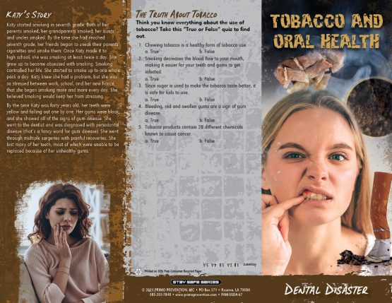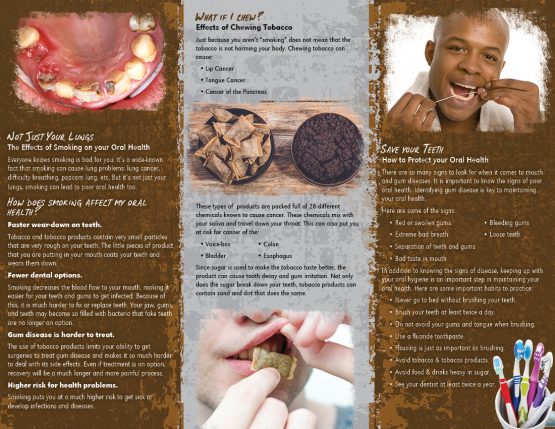 We’ve all probably heard how tobacco affects our health. But did you know how bad it is for your ORAL health? This pamphlet discusses the many problems that tobacco causes, including tooth decay, gum disease, etc. It also discusses ways to protect your oral health.