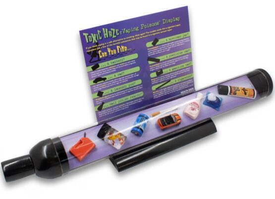 Dispel the myth that vaping is a safe alternative to smoking by revealing what’s really inside an e-cigarette’s toxic haze! This engaging, educational display features a large (29″ x 3½”) e-cigarette with eight models inside. The models unveil some of the harmful substances in e-cigarette aerosol vapor by associating them with other products also containing those substances, including: