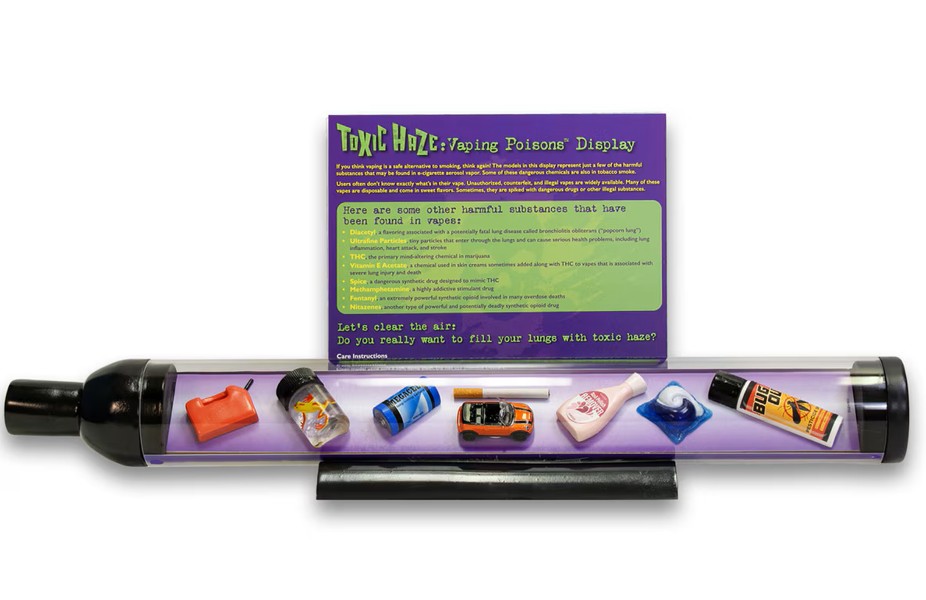 Dispel the myth that vaping is a safe alternative to smoking by revealing what’s really inside an e-cigarette’s toxic haze! This engaging, educational display features a large (29″ x 3½”) e-cigarette with eight models inside. The models unveil some of the harmful substances in e-cigarette aerosol vapor by associating them with other products also containing those substances, including: