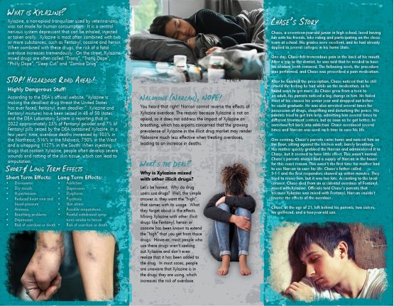 This pamphlet discusses how Xylazine is often mixed with several other deadly drugs, such as Fentanyl, Cocaine & Heroin, increasing the risk for overdose.