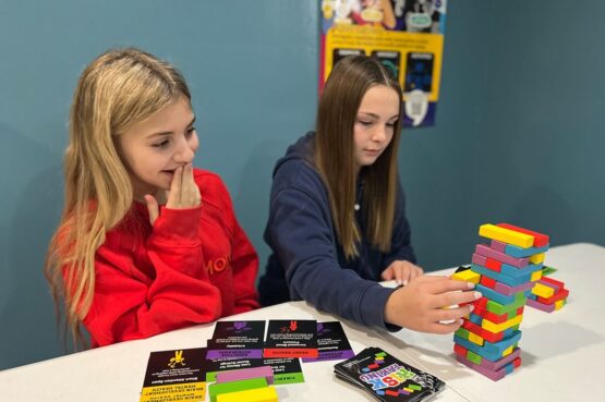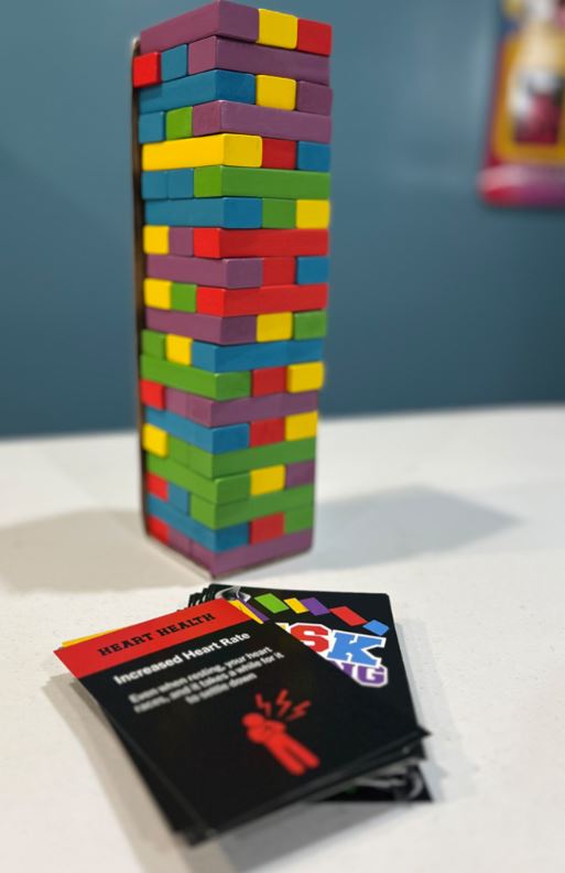 Vape Risk-Taking Game: Up to 8 players draw cards highlighting health risks like lung damage, addiction, and mental health issues. They remove blocks from a stack, which eventually collapses—symbolizing the cumulative toll of vaping on the body over time.
