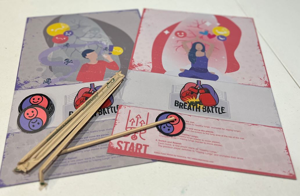 Breath Battle™: A hands-on activity demonstrating the impact of vaping on lung capacity. Participants compare lung function using compostable straws to move game pieces, simulating the effects of healthy and damaged lungs in a fun yet eye-opening way.
