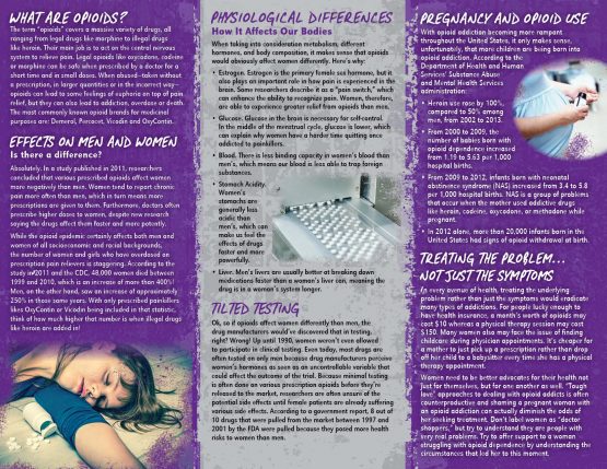This pamphlet examines how opioids affect women more negatively, because of factors like estrogen, glucose, blood, etc.