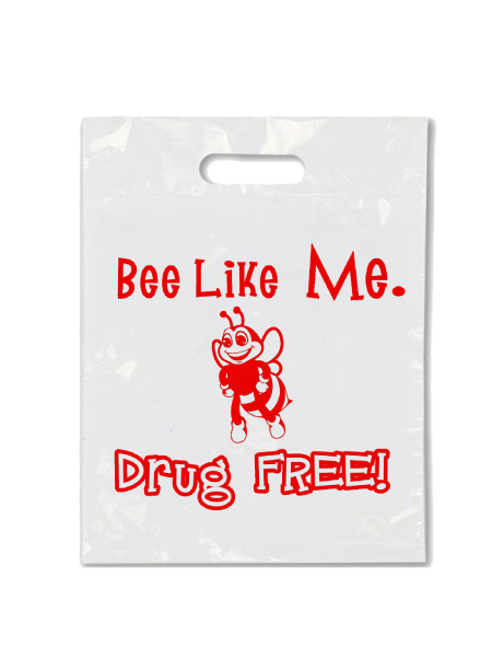 White litter bag with the Drug Prevention Month message “Drug Free I Can Be Anything I Want to Be” in red imprint.