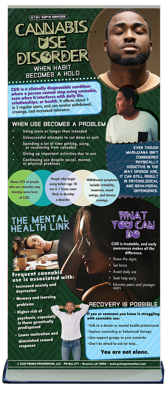 Portable, eye-catching, and professional. Use this colorful retractable banner to help educate others on Cannabis Use Disorder (CUD).