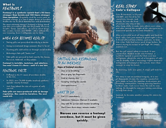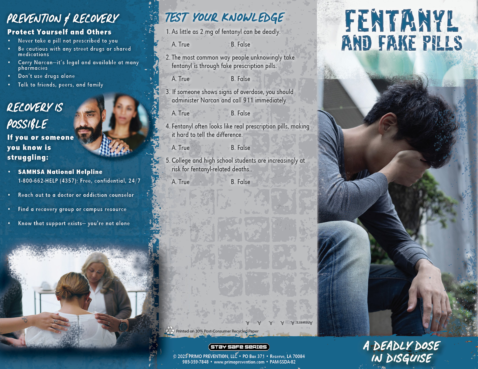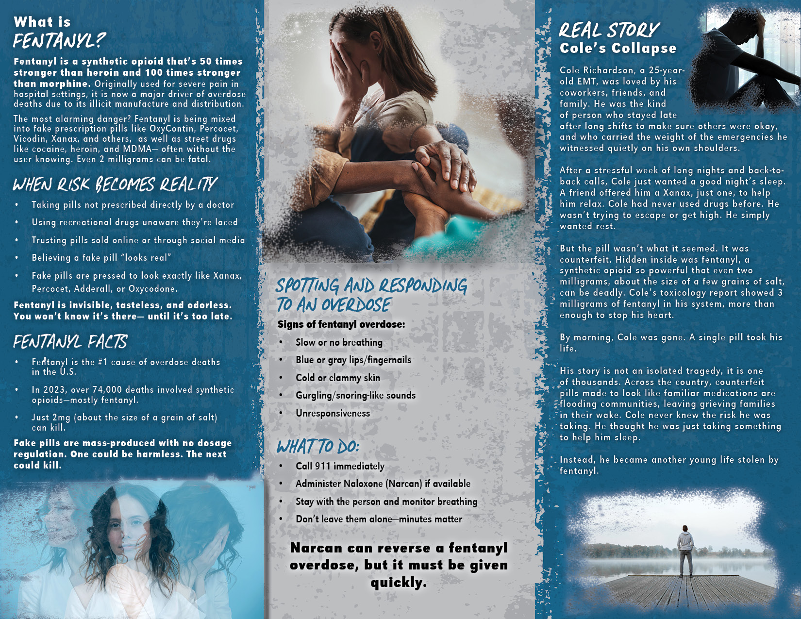 This pamphlet discusses how Fentanyl is being mixed with other illicit drugs, and is more and more being passed to look like real medication, like Xanax, Percocet, Adderall or Oxycodone.