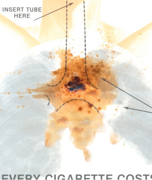 Each sheet shows an image of an actual lung X-ray that becomes covered in tobacco tar and nicotine when the Hand-Held Mechanical Smoker is used to “smoke” a cigarette, as shown in the second image here. It also explains how every cigarette smoked equals time of life lost to smoking.